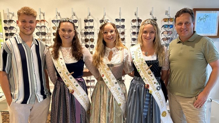 Throwback: Jeder der charmanten Damen hat eine wunderschöne Designerbrille von Sashee Schuster bekommen. Die Künstlerin aus Kinsau in Bayern, hat in ihren Brillen Hopfendoldenblätter eingearbeitet. Das transparente Acetatplattenmaterial schließt die Blätter ein und setzt das „grüne Gold“ richtig in Szene. Gerade im Zusammenspiel mit Dirndl und Scherpen, ein harmonisches Bild. Damit der Durchblick auch für die drei Damen immer gewährleistet ist, haben wir Markengläser der Firma Rupp und Hubrach verwendet.